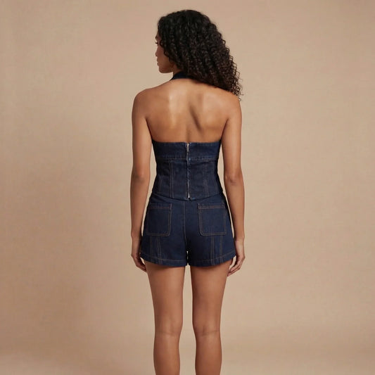 Women Halter Corset Top Denim Shorts Set